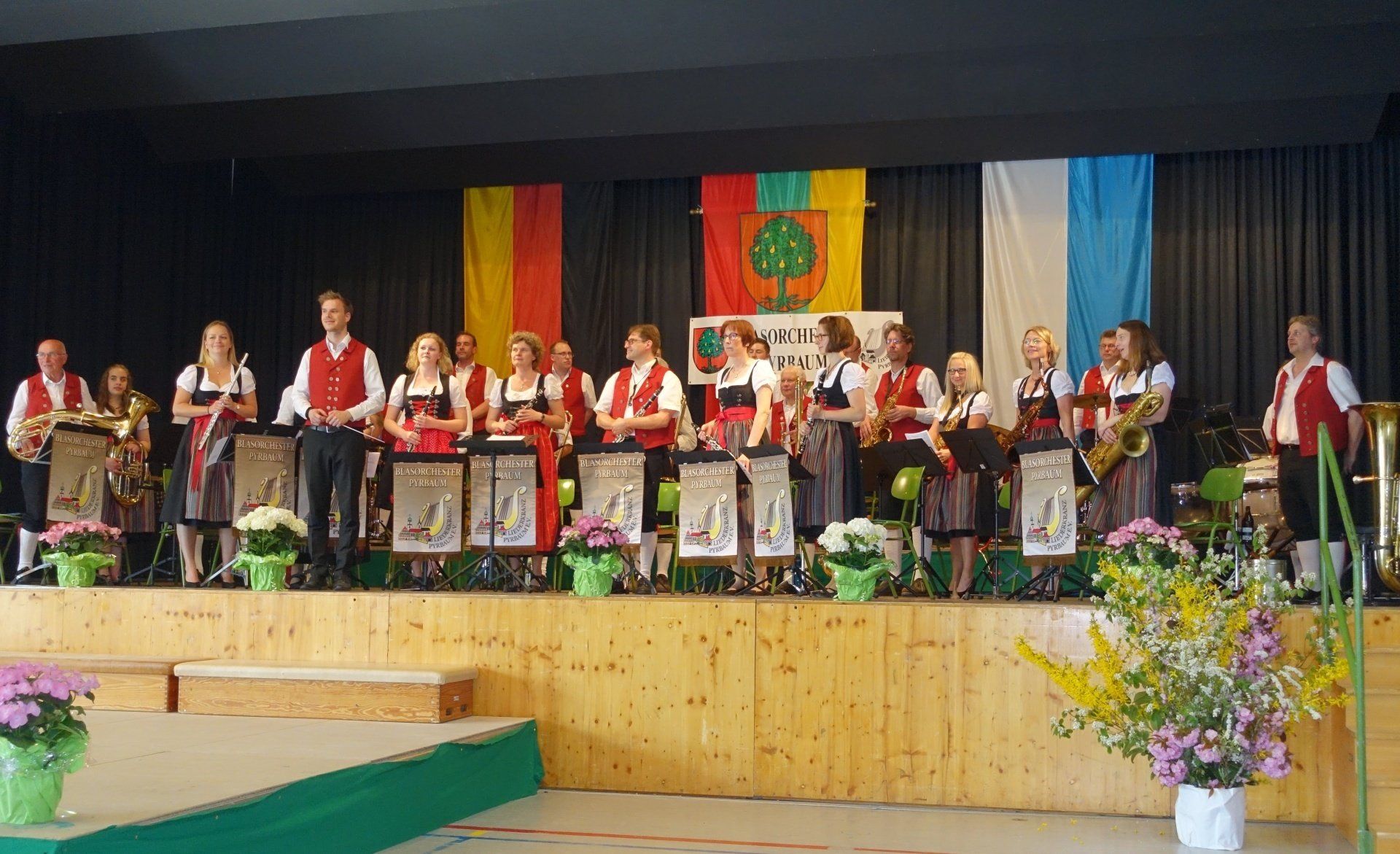 Hier die Aufstellung mit der Dorfmusik Seligenporten, dem Musikverein Pyrbaum und unserem 1. Bürgermeister Michael Langner und Albert Füracker.